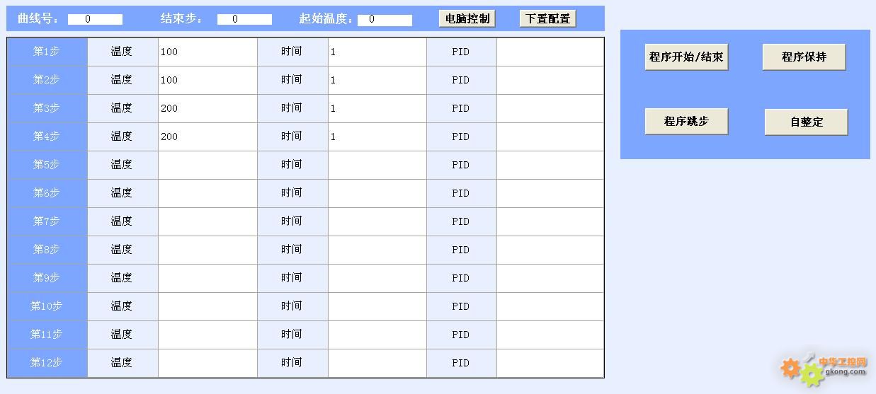 參數配置:當前調節的曲線號、結束步、起始溫度都可以設置,每一步的溫度、時間以及PID參數都可以按照預定的方案設置。