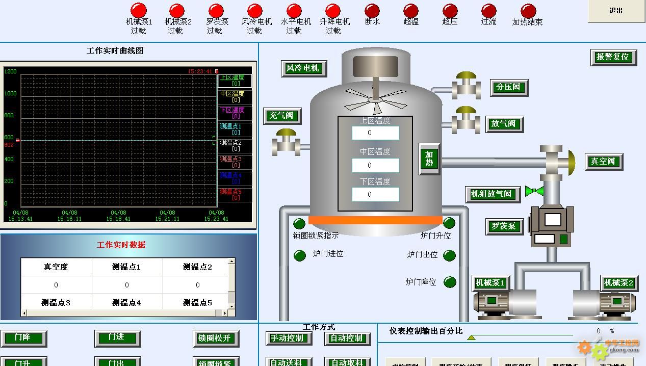輸出控制:具備權限的用戶,可以通過按鈕來控制真空爐的各種狀態,控制抽真空、加熱、爐門開關、臺車進出等,控制狀態能夠及時反饋,按鈕會根據不同的狀態顯示不同的顏色。