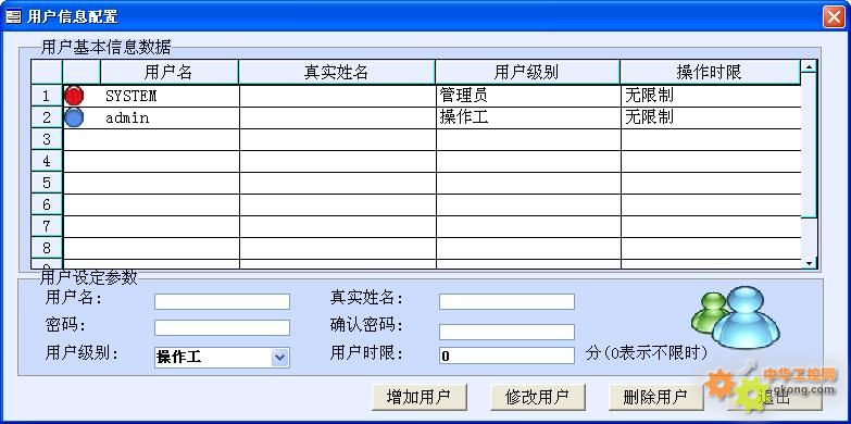 增加用戶:新建系統登錄用戶,能夠指定用戶名、密碼、姓名、用戶級別和用戶時限等參數,其中用戶級別可以根據需要設置。