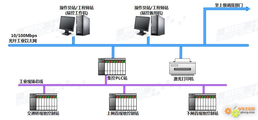 節制閘閘門集中控制系統主要是實現對節制閘工作閘門的現地控制設備進行數據通信,實現閘門遠程控制。同時,預留與上級計算機系統的接口,以及節制閘閘門集中控制設備與節制閘其它系統的協調,包括圖像監控系統、直流及UPS電源系統、火災報警及聯動控制系統等。上位監控軟件采用北京九思易自動化軟件公司開發的易控組態軟件。2臺監控計算機工作站互為冗余, 實現對工作閘門的遠程控制,預留有與上級計算機監控系統的通信接口,便于以后擴展;易控監控軟件主要完成數據處理功能、操作控制功能、信息管理功能、顯示功能和其它功能等。