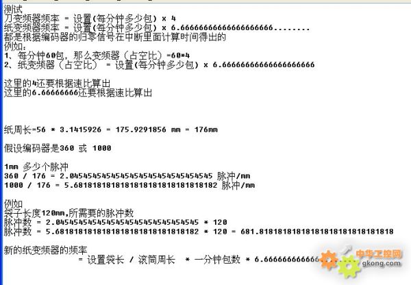 1、應枕式包裝機對精度的要求,我們在程序上下足功夫,各種計算采用浮點運算。 2、刀與膜之間的減速比為1:4和1:6.66666 3、圖2為部分計算公式