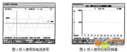 投入有源電力濾波器后,變頻器電網(wǎng)供電的波形及諧波含量均發(fā)生了變化,從圖3可以看出電流波形已變得接近正弦波,圖4中反映出變頻器的總輸入電流總畸變率減少到4.1%,5次諧波電流從原來(lái)的135A變?yōu)?7A,7次諧波電流從原來(lái)的78A變?yōu)?A,其他次數(shù)的諧波同樣得到了消除。有源電力濾波器的應(yīng)用為企業(yè)消除電網(wǎng)污染、節(jié)能降耗帶來(lái)了新的亮點(diǎn)。