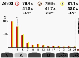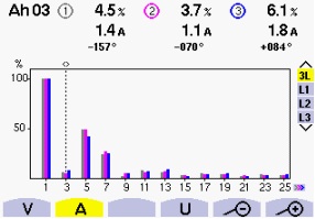 投入安裝ANAPF有源濾波器后LED屏控制開關柜進線側最大的總諧波電流含量降至51%,總諧波電壓畸變率降至3.1%,零線總諧波畸變率94.1%。3次諧波電流量A相1.4A、B相1.1A、C相1.8A、零線電流9.8A,含諧波功率因數提高至0.81。總諧波電壓畸變率THDu值降至3.3%。3次諧波電壓降至低于國標要求380V低壓側諧波電壓奇次畸變率THD≤4%的要求。 由上圖對比可見,ANAPF有源濾波器保護了LED供電系統安全、穩定、經濟運行,防止過電流速斷保護的誤動作,有利于電網和系統的安全穩定運行。