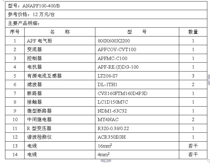 據反饋,自有源濾波器投運至今,裝車吊機運行故障率明顯降低,變頻器故障發生率由平均每月3-4次降到了每半年1次;皮帶秤故障由每月1次到不再出現故障。大大提高了裝車吊機運行的穩定性和工作效率。 4.3 ANAPF有源濾波器報價及主要元件清單