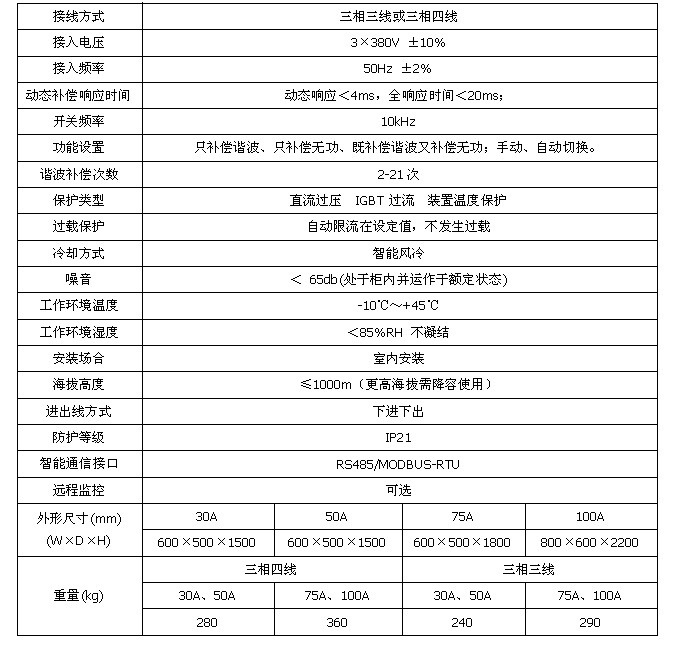 3.4 技術優勢 - DSP+FPGA全數字控制方式,具有極快的響應時間; - 先進的主電路拓撲和控制算法,精度更高、運行更穩定; - 一機多能,既可補諧波,又可兼補無功; - 模塊化設計,便于生產調試 - 便利的并聯設計,方便擴容; - 具有完善的橋臂過流、保護功能; - 使用方便,易于操作和維護。