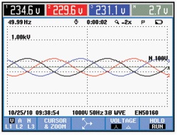 圖2 有源濾波器投入前相電壓波形 圖3 有源濾波器投入后相電壓波