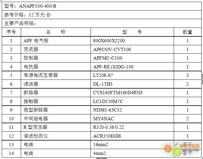 說明: 1、可以通過實測數(shù)據(jù)確定補償電流,或通過電力系統(tǒng)詳細信息(單線圖、變壓器、負荷情況等)計算出補償電流; 2、三線系統(tǒng)需配置2個或3個CT(用于A相和C相),四線系統(tǒng)需要配置3個CT(用于A相、B相和C相)。 2.2 ANAPF有源濾波器報價及元件清單