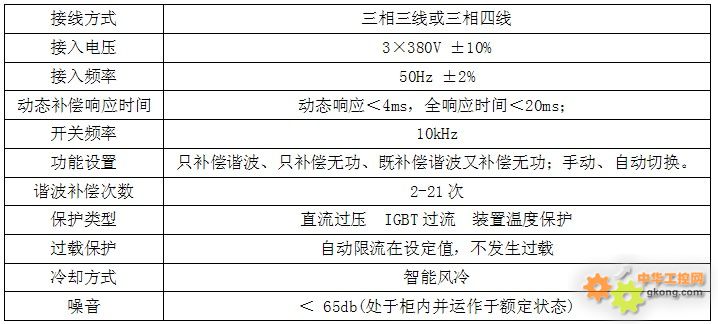 13波補償前電流頻譜圖 13波補償后電流頻譜圖 1.5治理效果 在10kV母線4段和5段使用兩套有源電力濾波器裝置進行治理后,系統(tǒng)諧波得到了很好的抑制,完全將11次、13次諧波限制在國家標準的范圍內(nèi),提升供電系統(tǒng)的供電可靠性,消除了系統(tǒng)諧波對電網(wǎng)系統(tǒng)影響的隱患,收到了良好效果,達到改善電網(wǎng)電能質(zhì)量的目的。 2、ANAPF有源濾波器簡介 2.1技術(shù)參數(shù)