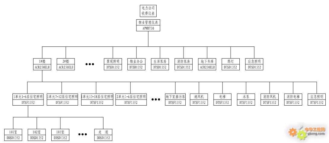 業(yè)主用電回路儀表按三層配置,第一層在每幢樓的進線處配置ˎ̥>ACR230ELH智能儀表。ˎ̥>ACR230ELH智能儀表可檢測三相電流、電壓、有功功率、無功功率、功率因數(shù)、視在功率、電網(wǎng)頻率、有功電能、無功電能、ˎ̥>2-31次分次諧波、總諧波含量、電壓波峰系數(shù)、電話波形因子、電流ˎ̥>K系數(shù)、電壓電流不平衡度、電壓電流序量、復(fù)費率電能統(tǒng)計、ˎ̥>SOE事件記錄。可記錄整幢樓的用電情況,并可檢測該幢樓的用電質(zhì)量。第二層按單元配置儀表,每個單元分別計量,如果各個單元的樓層數(shù)較多,可在ˎ̥>1個單元內(nèi)設(shè)置幾臺儀表計量。如上圖,每個單元配置ˎ̥>3臺ˎ̥>DTSF1352電能計量儀表,ˎ̥>DTSF1352儀表可檢測三相電流、電壓、有功電能,便于統(tǒng)計相應(yīng)樓層數(shù)的業(yè)主照明用電總量。第三層按戶計量,每戶業(yè)主分別安裝一臺ˎ̥>DDSD1352計量儀表,ˎ̥>DDSD1352儀表可檢測單相電流、電壓、有功功率、無功功率、視在功率、功率因數(shù)、電網(wǎng)頻率、有功電能,可直觀顯示出各戶業(yè)主的用電情況,為業(yè)主繳納電費提供依據(jù)。