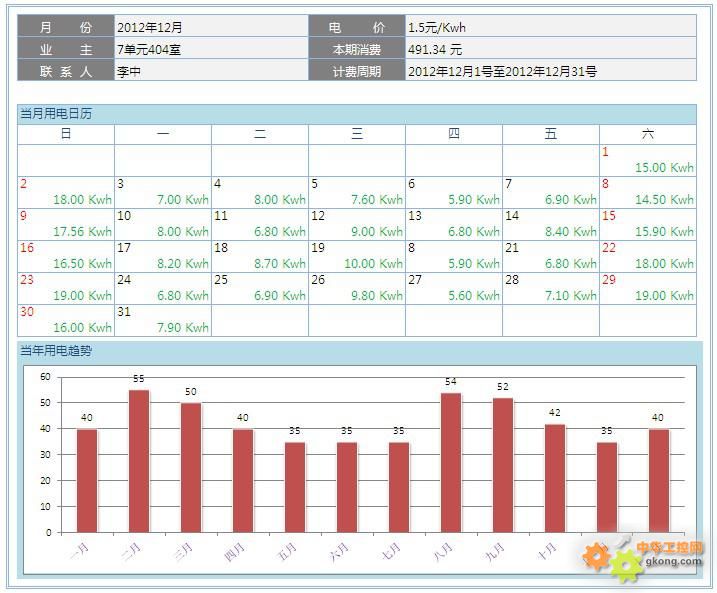 小區(qū)業(yè)主可以登錄系統(tǒng)查詢每個月的用電歷史記錄及消耗金額,系統(tǒng)以日歷的形式展現(xiàn)用電記錄,一目了然,同時以柱狀圖的形式顯示業(yè)主的月用電趨勢。