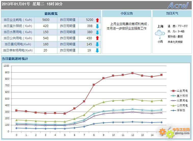 在小區(qū)物業(yè)電能收費主頁面上,物業(yè)管理人員可以了解當(dāng)天整個小區(qū)的用電情況,并與昨日進行比較,即時發(fā)現(xiàn)用電的不合理情況,小區(qū)用電主要區(qū)域的用電用折線圖表示。