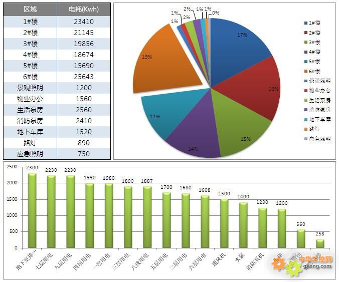 系統(tǒng)自動匯總指定時間段內(nèi)主要用電區(qū)域的用電量,并以餅圖形式顯示,當(dāng)點擊某個重點區(qū)域后,系統(tǒng)將進一步展開該區(qū)域用電的明細,使物業(yè)能清楚了解整個小區(qū)的用電情況。