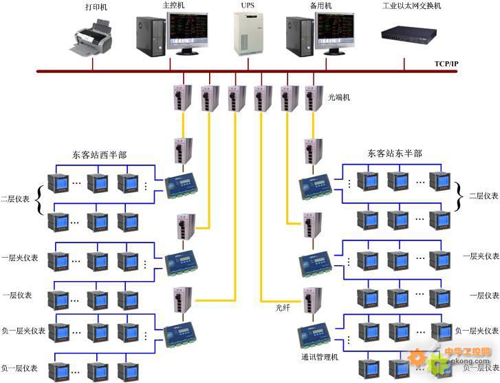在成都東客站中央監(jiān)控室,設(shè)置系統(tǒng)服務(wù)器(主/ 備雙機(jī)系統(tǒng)),系統(tǒng)控制計(jì)算機(jī)采用 windowsXP 操作系統(tǒng),應(yīng)用軟件采用 Acrel-5000 系統(tǒng)專用組態(tài)軟件,實(shí)現(xiàn)正常的監(jiān)測數(shù)據(jù)和遠(yuǎn)程配電設(shè)備狀態(tài)的集中呈現(xiàn)、事故過程記錄與分析、開關(guān)操作、數(shù)據(jù)存儲(chǔ)、數(shù)據(jù)的統(tǒng)計(jì)分析處理、多系統(tǒng)間的數(shù)據(jù)共享、事故報(bào)警等功能;配置激光打印機(jī)一臺(tái),可打印軟件產(chǎn)生的各種圖形、畫面、報(bào)表、事故報(bào)告、負(fù)荷曲線等;配置 UPS 不間斷電源設(shè)備一臺(tái),可應(yīng)對電網(wǎng)供電中斷的緊急情況,避免系統(tǒng)數(shù)據(jù)的丟失;系統(tǒng)主站通過光纖以太網(wǎng)絡(luò)同下位設(shè)備連接。