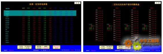 登陸普通權(quán)限用戶,通過主界面的操作,即可以查看各個(gè)區(qū)域運(yùn)行的電參量(電流、電壓、有功、無功、功率因數(shù)、電度、),對各個(gè)回路的分合閘狀態(tài)通過回路數(shù)據(jù)顏色變化來顯示出來(紅色代表合閘、綠色代表分閘)。同時(shí)各個(gè)回路都支持曲線查詢功能,通過該界面的操作即可查詢每一路的電流趨勢曲線。