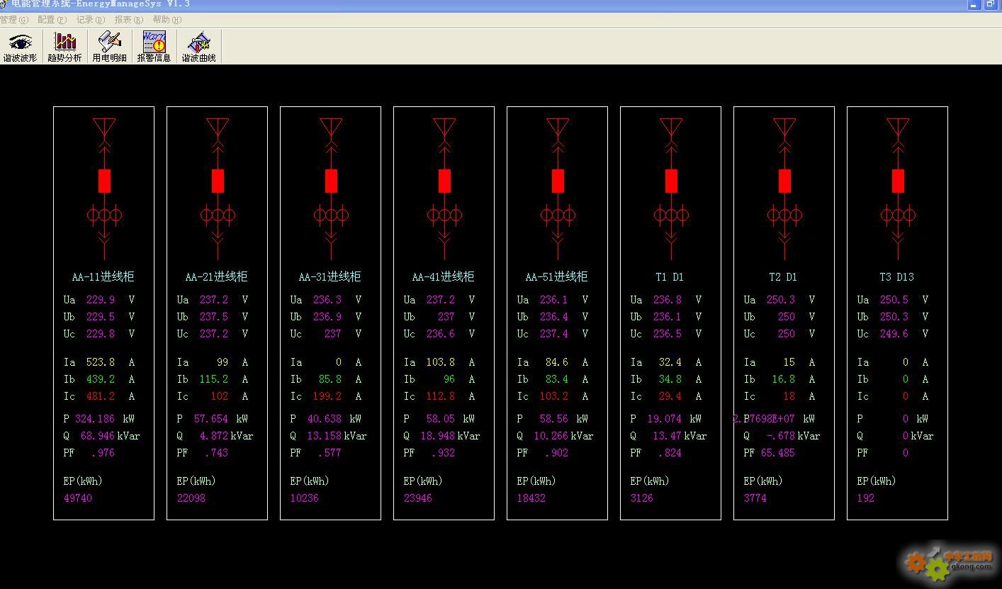 隨著社會的發展及電力的廣泛應用,電力監控系統已成為全國各地重點工程項目、標志性建筑/大型公共設施等大面積多變電所用戶的必然選擇,本文介紹的Acrel-2000電力監控系統在武漢愛機汽車配件有限公司3個變電所改造的應用,可以實現對變電所低壓配電回路用電的實時監控和電能管理,不僅能顯示回路用電狀況,還具有網絡通訊功能,可以與串口服務器、計算機等組成電力監控系統。系統實現對采集數據的分析、處理,實時顯示變電所內各配電回路的運行狀態,對模擬分合閘、負載越限具有彈出報警對話框及報警聲音提示,并生成各種電能報表、分析曲線、圖形等,便于電能的遠程抄表以及分析、研究。該系統運行安全、可靠、穩定,為變電所用戶解決用電問題提供了真實可靠的依據,取得了較好的社會效益。[2]