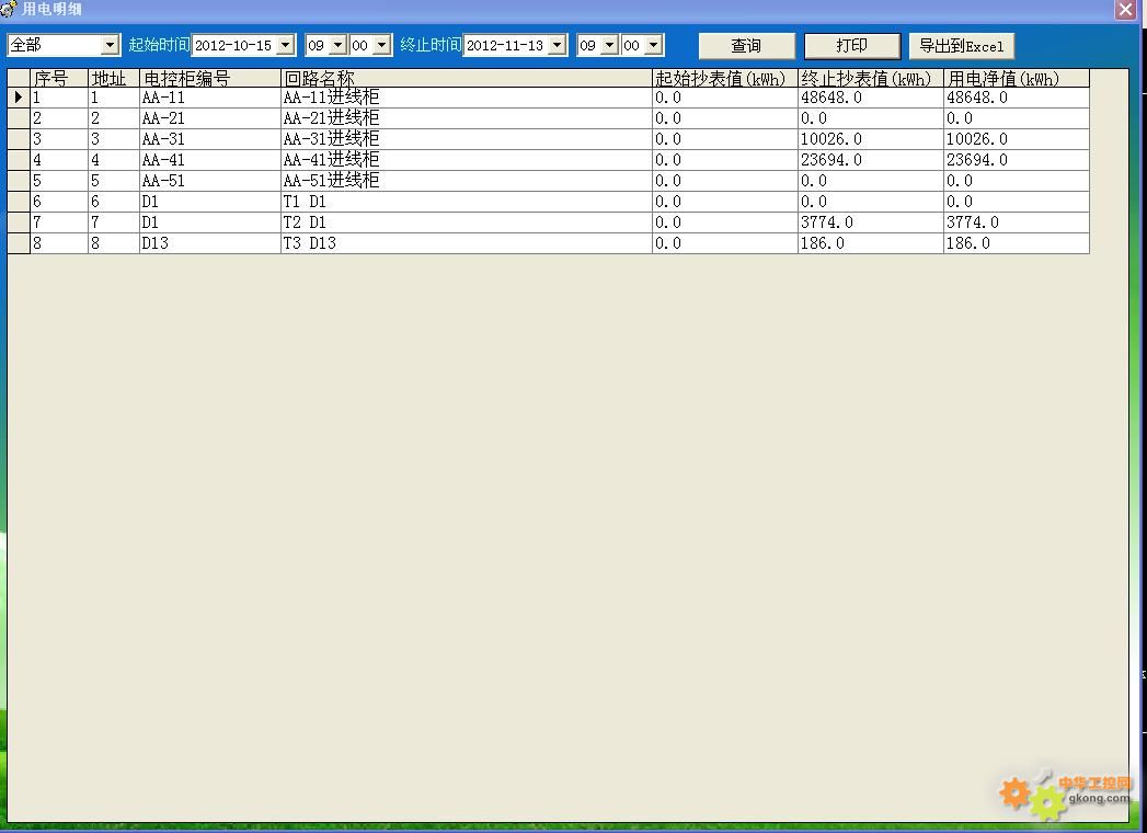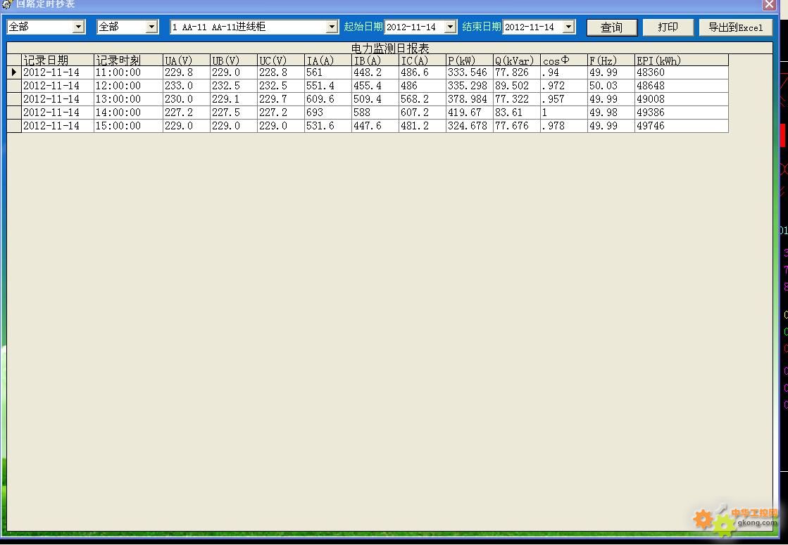 用電量報表功能,可選擇時間段進行查詢,支持任意時間段電度累計查詢,具備數據導出和報表打印等功能。為值班人員提供了精確可靠的電能報表。該報表各回路名稱和數據庫關聯,方便用戶修改回路名稱。 見圖(4)。