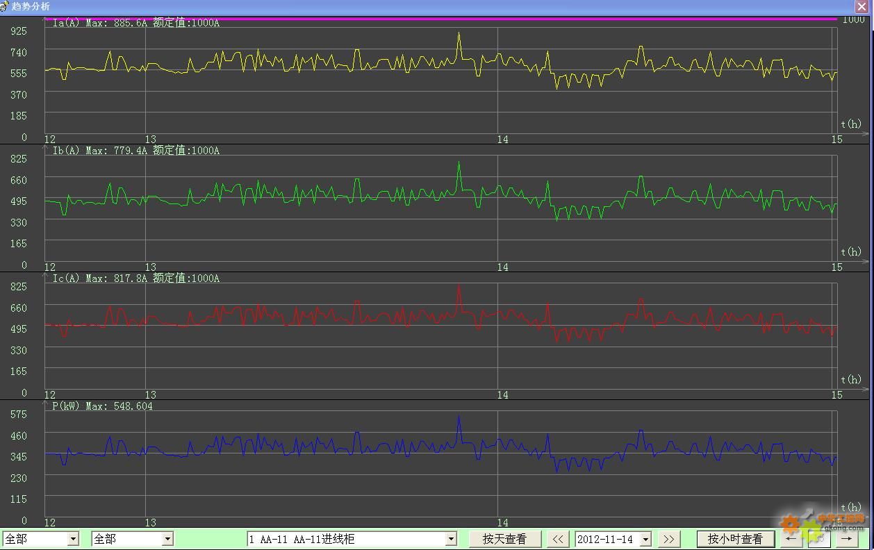 負荷趨勢曲線功能主要負責定時采集進線及重要回路電流和功率負荷參量,自動生成運行負荷趨勢曲線的,方便用戶及時了解設備的運行負荷狀況。點擊畫面相應按鈕或菜單項可以完成相應功能的切換;可以查看實時趨勢曲線或歷史趨勢線;對所選曲線可以進行平移、縮放、量程變換等操作,幫助用戶進線趨