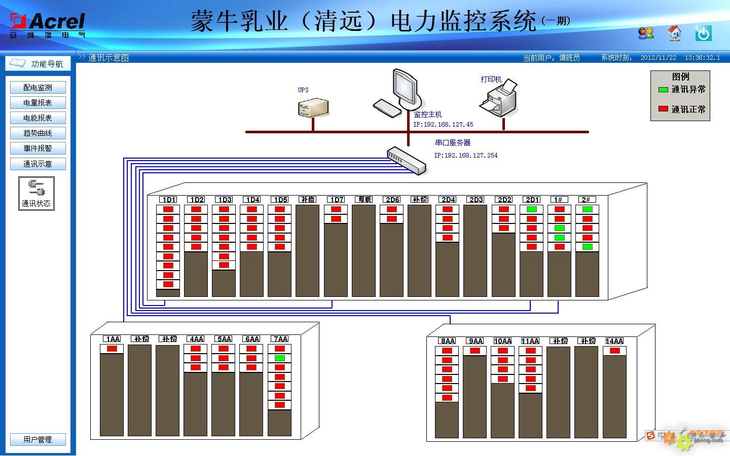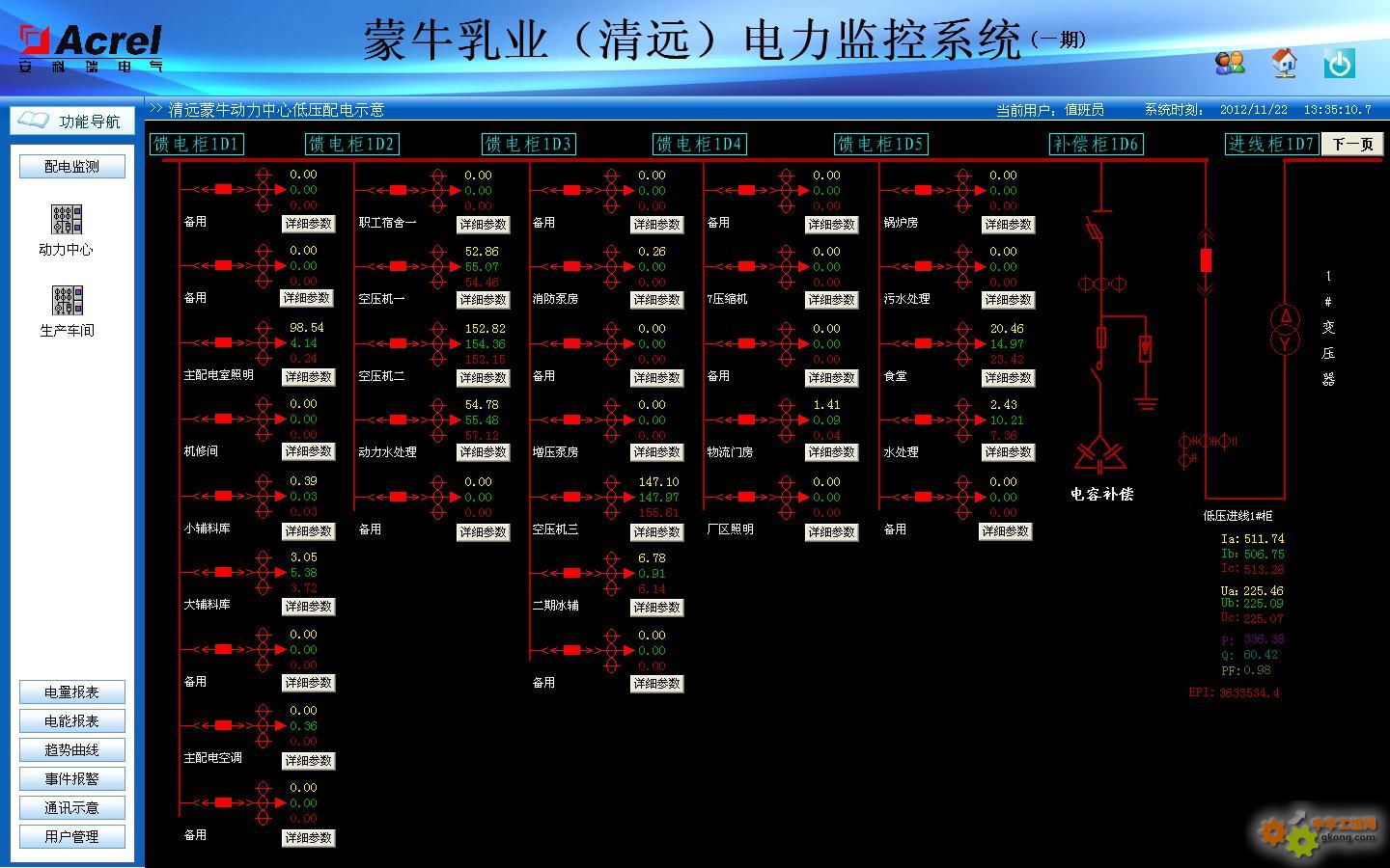 根據(jù)配電系統(tǒng)管理的要求,需要對清遠(yuǎn)蒙牛事業(yè)部一期和二期所有低壓配出線進(jìn)行電力監(jiān)控,且在一期與二期值班室內(nèi)需設(shè)有獨(dú)立的監(jiān)控系統(tǒng)平臺,同時該監(jiān)控平臺也可查看另一平臺的實(shí)時數(shù)據(jù),以保證用電的安全、可靠和高效。