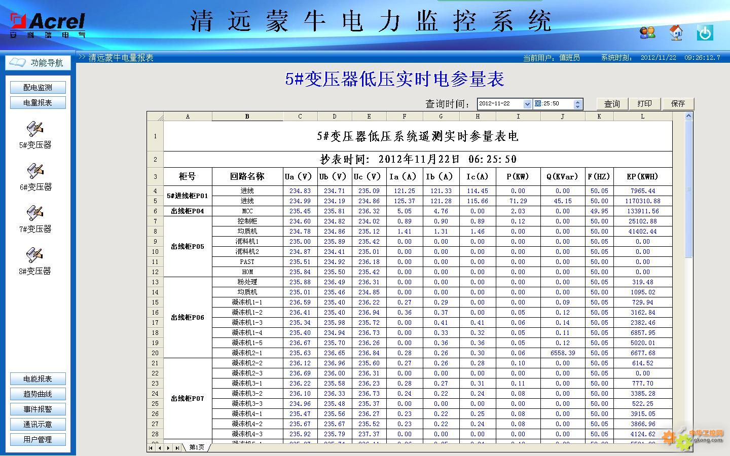 參數(shù)抄表功能,主要對低壓各出線回路的電參數(shù)進(jìn)線查詢。支持任意時刻電參數(shù)查詢,具備數(shù)據(jù)導(dǎo)出和報(bào)表打印等功能。該報(bào)表查詢供兩個變電所8臺變壓器出線各低壓回路的電參數(shù),主要包括:三相電壓、三相電流、有功功率、無功功率、頻率和有功電度。該報(bào)表各回路名稱和數(shù)據(jù)庫關(guān)聯(lián),方便用戶修改回路名稱,如圖(6)為5#變壓器回路實(shí)時數(shù)據(jù)顯示。