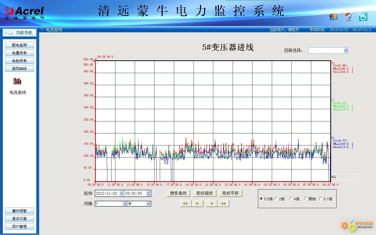 負(fù)荷趨勢曲線功能主要負(fù)責(zé)定時采集進(jìn)線及重要回路電流和功率負(fù)荷參量,自動生成運(yùn)行負(fù)荷趨勢曲線的,方便用戶及時了解設(shè)備的運(yùn)行負(fù)荷狀況。點(diǎn)擊畫面相應(yīng)按鈕或菜單項(xiàng)可以完成相應(yīng)功能的切換;可以查看實(shí)時趨勢曲線或歷史趨勢線;對所選曲線可以進(jìn)行平移、縮放、量程變換等操作,幫助用戶進(jìn)線趨