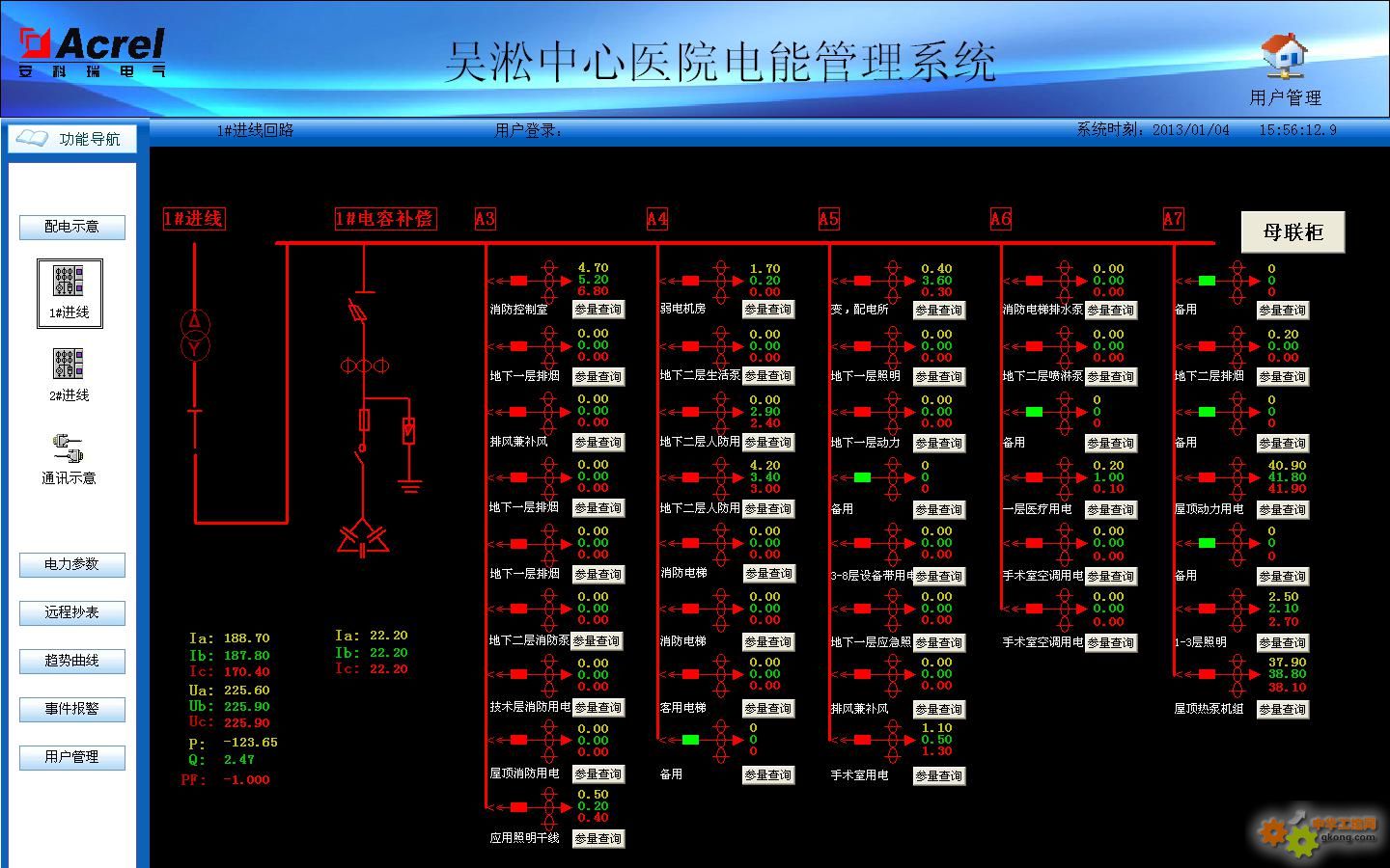 隨著社會的發展及電力的廣泛應用,智能電能管理系統已成為大型公共建造的必然選擇,本文介紹的電力儀表及Acrel-3000電能管理系統在吳淞中心醫院項目的應用,可以實現遠程遙測、遙信功能,實時顯示了現場電參量,方便值班人員查看;給高級用戶設置定值修改功能同樣人性化地提高了值班人員操作的安全系數;同時系統實現對采集數據的分析、處理,并生成各種電能報表、分析曲線、棒圖等,便于電能的遠程抄表以及分析、研究;報警窗口的彈出有助于提醒值班人員及時檢查現場設備的運行狀況。