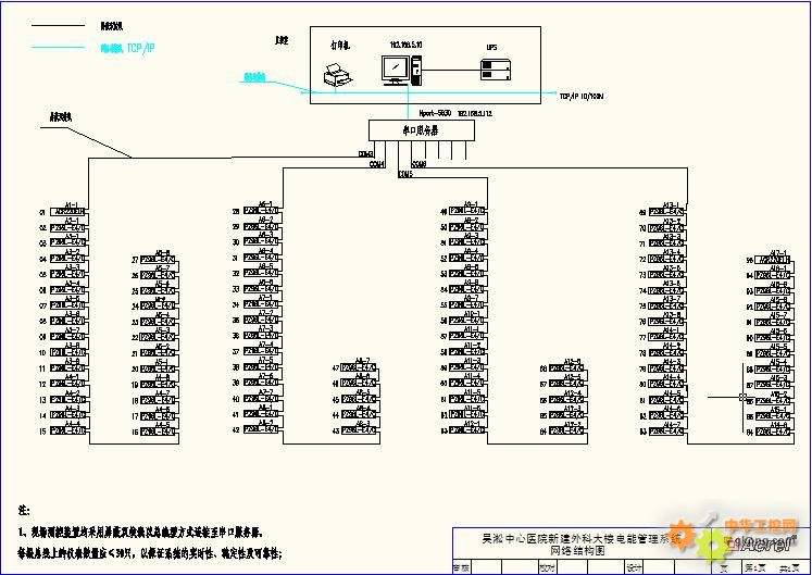 整套電能管理系統站控管理部分包括監控管理主機、打印機、UPS電源等;網絡通訊層部分包括一個16口的串口服務器;現場智能儀表監控設備層由ACR220ELH和PZ96L-E4組成。該配電系統分布在一個變電所內,2臺變壓器的所有電力儀表通過RS485總線連接至串口服務器,并經過超五類網線上傳至監控后臺。