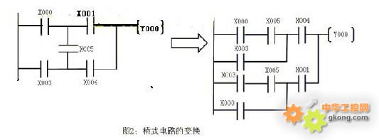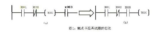 圖(b)中,X001和X002接點控制輔助繼電器M000,X003~X005接點控制輔助繼電器 M001,再由兩個繼電器M000,M001接點的并聯(lián)組合去控制線圈Y000。這樣邏輯關系沒變,卻把雙線圈變成單線圈。 |