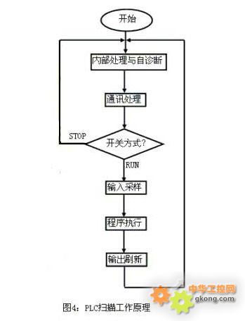 PLC的CPU采用循環(huán)掃描的工作方式。一般包括五個階段(如圖所示):內(nèi)部診斷與處理,與外設進行通訊,輸入采樣,用戶程序執(zhí)行和輸出刷新。當方式開關處于STOP時,只執(zhí)行前兩個階段:內(nèi)部診斷與處理,與外設進行通訊。