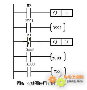 程序分析:M0閉合,程序跳至P0處(不執(zhí)行X001語句),M0常閉斷開,CJP1不會發(fā)生,執(zhí)行下一語句。此時,Y003將X002狀態(tài)進行驅(qū)動。M0斷開時,程序順序執(zhí)行并按X001的狀態(tài)對T003進行驅(qū)動,M0常閉閉合,跳至P1按X003狀態(tài)對 Y004進行驅(qū)動,即跳過了X002驅(qū)動Y003的語句。可見,在同一時刻,Y003驅(qū)動只有一個可以發(fā)生。此時,雙線圈利用是可以的。