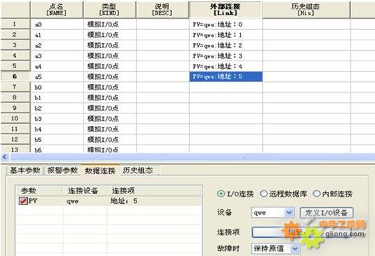 將驅動程序拷貝到軟件安裝目錄后,進入組態環境,建立設備驅動。然后進入點組態界面,建立模擬點并組態外部連接,連接到新建的設備名稱,用于LED大屏幕數據的下置,點連接項中只需要填入數據下置的十進制地址即可。這里需要說明一下,該驅動只支持寫操作(即數據的下置),不支持讀操作(即數據的采集)。