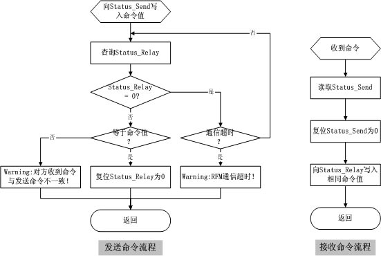 發(fā)送命令流程:發(fā)送方向Status_Send寫入命令值,并不斷查詢Status_Reply。當查詢到同樣的命令值時,表示接收方已經(jīng)正確收到發(fā)送方命令;當查詢到與發(fā)送不同的命令值時,表示接收方?jīng)]有正確接收到命令;當查詢時間大于1s時,表示接收方?jīng)]有收到命令;然后發(fā)送方復位Status_Reply為0。
