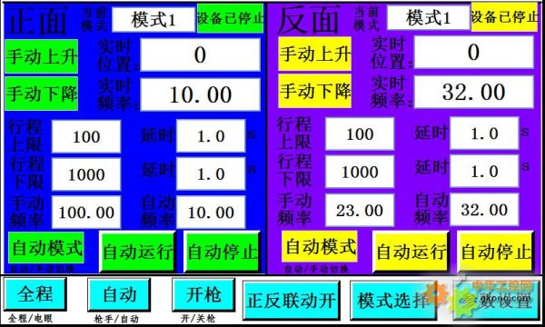 運行畫面主要分為正反面兩部分,分別對應兩臺設備,因此參數(shù)也是左右對應的。畫面顯示了當前往復機的實時位置和實時頻率,以及當前的工作模式。程序上允許設備在運動過程中進行行程上/下限、延時、頻率的修改。每一次切換手動/自動模式設備自動回原點,等待命令。畫面底部的正反聯(lián)動按鈕用來開啟/關閉兩臺設備的聯(lián)動模式,開啟聯(lián)動模式倆設備同步工作。