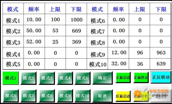 配方畫面提供了十組配方供客戶使用,根據(jù)需求選擇相應的模式后點擊確定即可將配方數(shù)據(jù)下載到目標參數(shù)中。 設備運行過程中,若進行模式的修改,設備將先回原點之后進行修改模式后的動作。