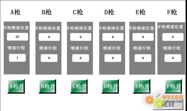 噴槍設置畫面總共有6把噴槍,可以手動設置每一把噴槍的開槍起始位置和噴射的持續(xù)時間也可以在教學模式下自動識別。通過對安裝在X軸電機齒輪邊上的接近開關進行信號計數(shù)(齒輪每轉動過一個齒發(fā)一個信號),操作員在教學模式下在當物料接近噴槍的時候點擊開槍,當物料離開噴射點的時候點擊關槍,系統(tǒng)便能自動的記憶住改物料的起始噴槍位置和噴射時間。