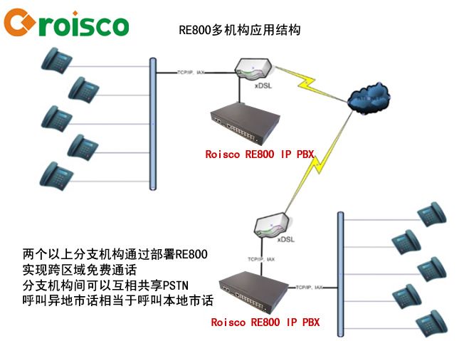 隨著市場競爭日趨白熱化,加快公司內部的信息溝通,提升管理水平,降低經營成本,提高工作效率、統一企業形象成為了每一個連鎖經營企業迫切需要解決的問題。 二、方案概述 隨著互聯網的飛速發展,中國網絡狀況的不斷改善,基于寬帶通信網絡,建立總部與分店間的語音、數據和豐富的業務應用整合到單個系統IP-PBX中已經成為可行。 以降低開支、方便系統內部間通話、有效管理、提升企業整體形象為基本原則,通過數據網建立一個覆蓋整個連鎖店企業的內部電話網絡: 節省話費: 總部及各個分店之間的“0話費”通話。 提供電話會議系統,實現會議“異地0費用”。 各個分店的長途電話都從總部撥出,提高總部對電信部門的議價能力。 高效管理: 總部可以對所有分機設備進行設定,并為每個員工分配一個賬號,每個分機設備可以支持不同的賬戶登入。同一個員工也可以在不同的分店登入。解決人多電話少、員工在分店間流動的問題。 總部可以為每一個員工分配呼叫權限(如長途、市話、系統內部電話等)和功能(呼叫轉移、免打擾、訪問語音信箱、登入隊列、報時、報分機號碼、報IP地址、叫醒服務等)。 總部可以查看所有電話的呼叫記錄,以圖表的形式顯示,并可以下載保存。 總部可以實時監聽所有分店呼出電話、分店之間的電話、分店與總部間的電話。 所有分店之間、分店與總部之間、分店呼出呼入的通話都進行電話錄音。 網絡傳真,無紙化傳真,總部統一接收、發送和管理傳真,總部和分店間的傳真文件通過電子郵件收發,減少對傳真的投入,加強管理。 總部可以查看、保存、管理系統上所有產生的文件,包括通話錄音文件、留言錄音文件、傳真文件、系統語音文件、日志文件、系統配置文件等。 三、系統構建 硬件配置 總部采用IP寬帶入網,有公網IP地址,帶寬10M以上 分店采用ADSL入網,上行帶寬1M以上 總部中心機房放置UPS電源一臺(斷電持續時間2小時以上) 總部中心機房放置路由器一臺,提供網絡路由,總部中心機房放置ROISCO RVX2000設備一套,作為IP-PBX的中心服務器。 總部中心機房放置備份服務器一臺,冗余備份。 每個分店一部網絡電話,分公司配置一臺ROISCO RE800。 網絡環境要求 總部采用2M專線接入互聯網 分店采用ADSL入網,上行帶寬1M 說明:如果需要開通網絡電話會議功能,或者網絡上還需要走其它數據,應適當增加網絡帶寬。