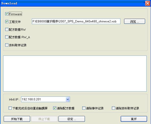MT8000系列人機帶有以太網接口,通過Ethernet網絡,可以實現對遠程人機或者PLC數據的監控,同時也可以實現對遠程MT8000人機下載程序。 MT8000遠程監控系統的結構圖如下:  其中,MT8000人機上可以連接多種控制器。 實現MT8000的遠程監控功能,首先要對被訪問的MT8000人機所在的局域網的路由器進行設置,方法如下: 1.MT8000的IP設置 觸摸機器的右下角,會在機器底部出現一條工具欄,左面有4個圖標,如圖示  點擊第四個“System Setting”圖標,輸入密碼后(默認密碼111111),出現如下圖所示對話窗口: 在“Netword”一欄中,設定機器的IP地址,完成后保存確定即可。建議設定后重啟一下機器再下載程序。 同時,在EB8000軟件中,設置MT8000的端口號,如下圖所示,可以設為8000.  2.路由器的設置 通過設置路由器,將8000端口號映射到MT8000人機的IP地址上。以TP-LINK路由器為例介紹設置: 在IE地址欄中輸入IP:192.168.1.1,彈出窗口如下圖所示:  輸入路由器對應的用戶名和密碼后,進入路由器的設置界面,將虛擬服務器設置成如下圖所示,即將端口8000映射到MT8000的IP地址,同時將下載的20248端口也映射到MT8000的IP地址。  路由器設置完成后,保存退出就可以了。 同時,也要注意查看一下外網的IP,此時IP為:221.0.152.26。 3.MT8000遠程監控 打開EB8000軟件,新建一個程序,此程序即用來模擬監控遠程人機的數據。系統參數設置如下:  添加完遠程MT8000人機的設備清單如下圖所示:  然后,在EB8000的編輯界面中,設置2個元件: 位狀態切換開關,設置如下圖所示:  注意:PLC名稱處,選擇的是遠端人機對應的名稱。 再放置一個數值輸入元件,如下圖所示:  注意:PLC名稱處同樣要選擇遠端人機對應的名稱。 設置完成后,既可保存編譯程序,執行離線模擬或者在線模擬,當切換LB0的狀態時,遠端MT8000人機上的LB0的狀態會對應的改變;當在電腦上對LW0輸入一個數值時,在遠端的MT8000人機上的LW0地址會顯示電腦上輸入的數值。相反地,也可以在電腦上查看遠端MT8000人機上的數據變化。 至此,即實現了MT8000的遠程監控功能。 4.MT8000遠程下載和上傳 在遠端MT8000人機所在局域網的路由器已經設置好的基礎上,即可開始遠程下載和上傳操作了。 在電腦上打開EB8000軟件,在“Project Manager”窗口上,點擊“下載”按鈕,出現如下圖所示對話框,  [Firmware]一般第一次下載時會選中 [工程文件]要下載到遠端MT8000 人機中的XOB文件所在路徑 [配方數據RW]如果有此配方文件,需要選中 [配方數據RW_A]如果有此配方文件,需要選中 [資料取樣記錄]如果有此資料取樣記錄文件,需要選中 [HMI IP]此處填寫遠端MT8000 人機的IP地址,為:221.0.152.26 [下載完成后自動重啟觸摸屏]如果此項被勾選,程序下載完成后會重啟觸摸屏 [清除配方數據]如果此項被勾選,下載程序前會將機器中的所有配方數據清除為0 [清除事件記錄]如果此項被勾選,下載程序前會將機器中的所有事件記錄文件event log清除 [清除資料取樣記錄]如果此項被勾選,下載程序前會先清除機器上存在的所有Data log文件 設置完成后,點擊“開始下載”,出現提示程序下載進度的對話框,當最后顯示“完成”時,即程序已下載完畢。 也可以在EB8000軟件的編輯界面中,點擊 執行下載,設置窗口如下所示:  無論哪種路徑下載,下載進度的提示信息都是相同的。 如果是遠程上傳,則在EB8000的“Easy Manager”窗口上點擊“上傳”按鈕,出現下圖所示的對話框:  [工程文件]選擇好將上傳的XOB文件保存在電腦的哪個路徑下面 [HMI IP]即遠端MT8000人機所在局域網的外網IP,此處為:221.0.152.26 設置好,點擊“上傳”按鈕,程序開始上傳。
