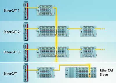 此外,EtherCAT 橋接端子模塊可以集成下位 PC 機(jī) - 例如 Beckhoff CX 系列嵌入式 PC - 在 EtherCAT 網(wǎng)絡(luò)中用作為 EtherCAT 從站。在這種情況下,CX 系統(tǒng)通過橋接端子模塊與上位 EtherCAT 系統(tǒng)相連。