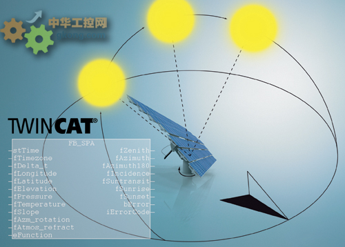 Beckhoff 的 TwinCAT 太陽位置算法軟件功能塊能夠在不使用傳感器的條件下,準確計算全球任何時間任何地點的太陽角度。這種靈活的解決方案對拋物線太陽能面鏡、太陽能光伏系統以及其它太陽能發電設備的太陽追蹤設計帶來了極大的便利,它能夠自動追蹤太陽位置,最大限度地獲取太陽輻射。該軟件的控制算法極為精確,對于太陽角度的誤差計算精度可達到 ±0.001°,該軟件也可用于其它應用場合,如樓宇的自動控制系統或者風力發電機的陰影閃爍率計算。