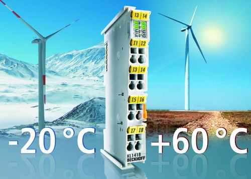 長期以來,Beckhoff 總線端子模塊系統在設備自動化和樓宇自動化領域已得到成功應用,其工作溫度范圍符合 0…55 °C(32…140 °F)的標準,可完全滿足這些應用領域的要求。而為了應對氣候條件比較惡劣的“室外應用領域”,Beckhoff 已將一些精心挑選的標準總線端子模塊和耦合器的工作溫度范圍擴展為 -20…+60 °C (-4…140 °F)。這些產品主要應用在新能源系統中,如風力發電、太陽能發電或潮汐發電設備,而這些設備經常需要在極端氣候條件下運行。