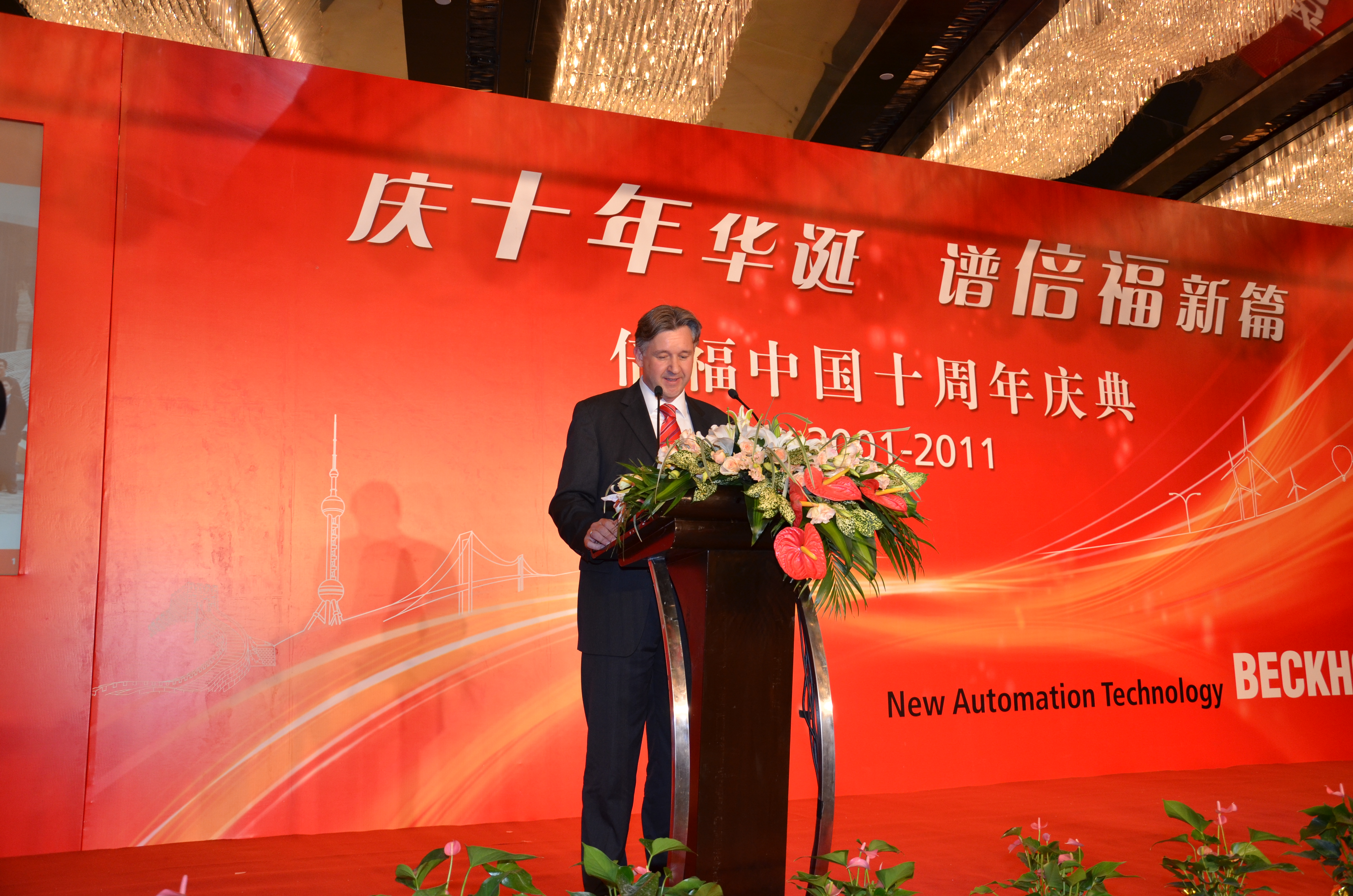 2011年5月26日,主題為“慶十年華誕,譜倍福新篇”的賀倍福中國成立十周年活動在上海世貿皇家艾美酒店隆重舉行。中國自動化學會副理事長席裕庚教授,中國機電一體化技術應用協會秘書長王軍女士,上海市自動化學會秘書長、上海交通大學自動化系主任李少遠教授,中國自動化學會理事、PLCopen國際組織中國委員會主席彭瑜教授,上海市北工業園區高新(集團)有限公司總經理周群女士等領導、媒體和客戶代表逾260人出席了當天活動。大家歡聚一堂,追憶往昔,共享成就,展望未來。