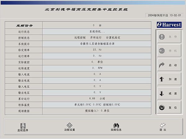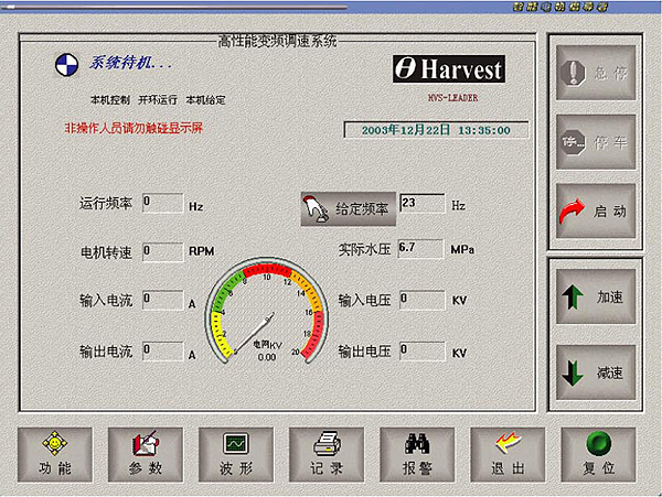 本機控制 直接利用變頻調(diào)速系統(tǒng)柜門主界面的啟動、停機、調(diào)速等按鈕實現(xiàn)變頻調(diào)速系統(tǒng)的控制操作。 上位機控制(非標(biāo)配置,由用戶自選) HARSVERT-A系列高壓變頻調(diào)速系統(tǒng)可以通過上位機進行實時狀態(tài)監(jiān)控,并可進行啟動、停車、急停、復(fù)位、設(shè)定運行頻率、參數(shù)刷新、查看故障記錄等控制操作。同時,一臺上位機可監(jiān)控多臺下位變頻調(diào)速系統(tǒng)的運行。 DCS控制 靈活的可編程數(shù)字量和模擬量接口,可與DCS直接連接,實現(xiàn)設(shè)備與現(xiàn)場過程控制的完善結(jié)合。 遠程撥號控制(非標(biāo)配置,由用戶自選) 用戶在異地可以通過電話網(wǎng)絡(luò)計算撥號對變頻調(diào)速系統(tǒng)進行異地遠程監(jiān)控。 |