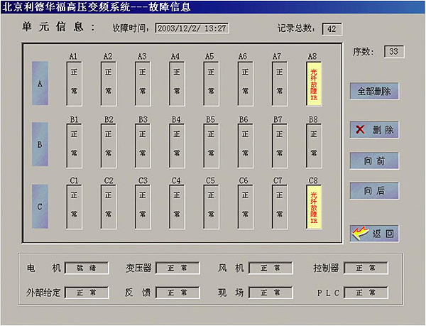 控制器 控制器由高速單片機處理器、人機操作界面和PLC共同構(gòu)成。其中人機操作界面有三種配置:工控PC機界面、嵌入式工控機界面、標(biāo)準(zhǔn)操作面板界面,用戶可根據(jù)需要進行選擇。單片機實現(xiàn)PWM控制。人機操作界面解決高壓變頻調(diào)速系統(tǒng)本身和用戶現(xiàn)場接口的問題,提供友好的全中文監(jiān)控界面,使用方便、快捷,同時可以實現(xiàn)遠程監(jiān)控和網(wǎng)絡(luò)化控制。內(nèi)置PLC則用于柜體內(nèi)開關(guān)信號的邏輯處理,可以和用戶現(xiàn)場靈活接口,滿足用戶的特殊需要。 控制器與功率單元之間采用光纖通訊技術(shù),低壓部分和高壓部分完全可靠隔離,系統(tǒng)具有極高的安全性,同時具有很好的抗電磁干擾性能,可靠性大大提高。另外,控制電源掉電時,控制器可由配備的UPS繼續(xù)供電,(散熱風(fēng)機電源取自移相變壓器)變頻器可以繼續(xù)運行。