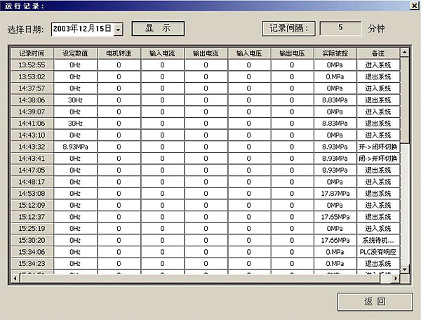運行記錄設(shè)定 變頻器運行時自動記錄的參數(shù)包括給定頻率、電機轉(zhuǎn)速、輸入電流、輸出電流、輸入電壓、輸出電壓、實際被控及系統(tǒng)狀態(tài)信息。所有記錄的運行參數(shù)按文本文件格式存放于計算機非易失存儲器中,每天作為一個文件,以日期作為文件名,記錄時間間隔由用戶設(shè)定。 |