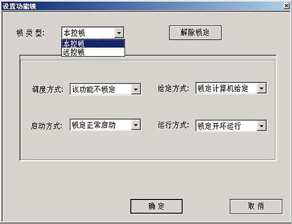 功能鎖設(shè)置 通過功能鎖的設(shè)定,可以定義本控鎖和遠控鎖,用來鎖定在本控或遠控的情況下,系統(tǒng)的調(diào)試方式、給定方式、啟動方式、運行方式。當(dāng)系統(tǒng)處于本控或遠控的情況下,系統(tǒng)將按照功能鎖自己綁定各項功能。 |