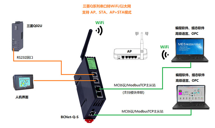BCNet-Q-S用于三菱Q系列PLC圓口的以太網數據采集,非常方便構建生產管理系統。模塊集成WiFi功能,支持AP模式、STA模式和AP+STA模式,非常方便構建WiFi網絡,直接通過WiFi進行PLC編程、數據采集。BCNet-Q-S不占用PLC編程口,即編程軟件/上位機軟件通過以太網對PLC數據監控的同時,觸摸屏可以通過復用接口X2與PLC進行通訊。