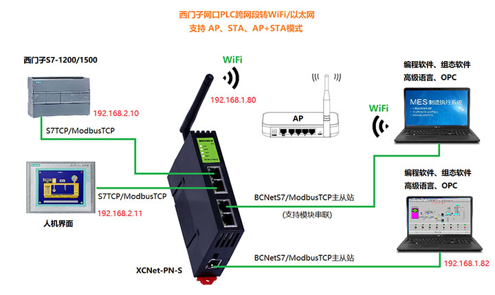 XCNet-PN-S的LAN1/LAN2/WiFi具備跨網段功能,能將LAN1口的S7TCP協議轉換成LAN2/WiFi接口的ModbusTCP協議和BCNetS7協議,LAN2/WiFi支持ModbusTCP主從站通訊功能。