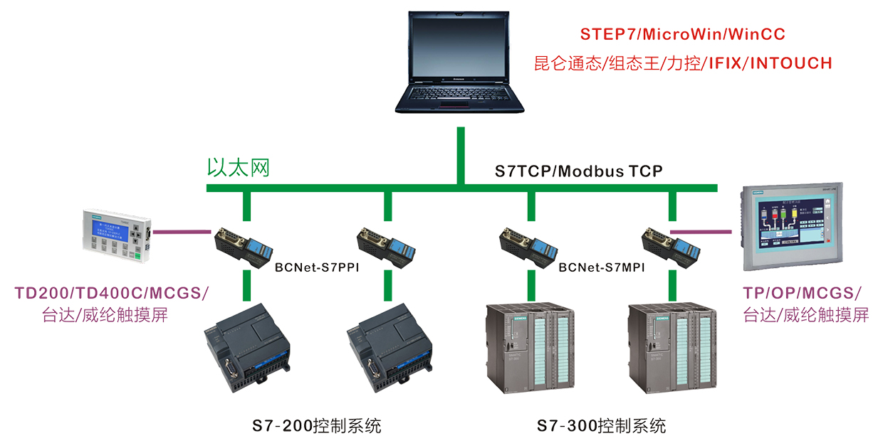 BCNet-S7PPI橋接型:可以連非西門子觸摸屏,如昆侖通態(tài)、威綸、臺達、步科、海泰克、施耐德等。