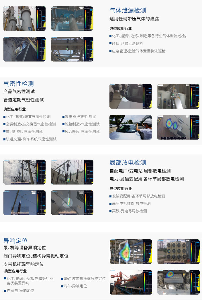 產品可應用于帶壓氣體泄漏、真空泄漏、異響定位、氣密性測試、局部放電檢測等方向。