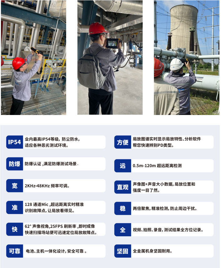 手持式聲學成像儀集成采集、處理、顯示,記錄功能于一身,內部配大容量鋰電池實現超長續航, 7 寸顯屏幕清晰查看故障,拍照、錄像多種方式記錄故障點信息。配套PC工具一鍵生成報告。讓巡檢 人員及質檢人員高效、精準定位故障。該產品可應用于帶壓氣體泄漏、真空泄漏、異響定位、氣密性 測試、局部放電檢測等方向,真正意義上的多功能故障檢測儀。