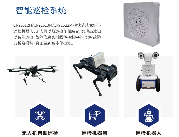 CRY2600M系列模塊式成像儀是面向7X24小時在線故障監測系統及配合巡檢機器人、無人機等組 成的智能無人巡檢系統而開發的智能前端。數據通信協議支持RTSP、RTMP及國標接口方便集成。